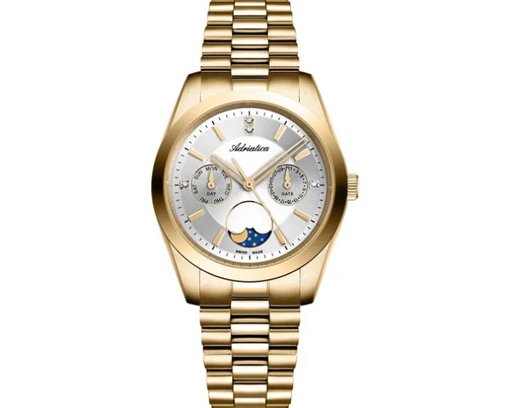 Cechy: datownik, wskazówkowy, sekundnik, wskaźnik dnia tygodnia, wskaźnik faz Księżyca