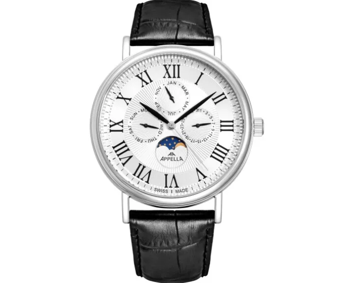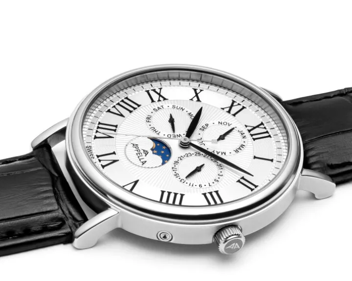 Cechy: datownik, wskazówkowy, sekundnik, wskaźnik dnia tygodnia, wskaźnik faz Księżyca, wskaźnik miesiąca