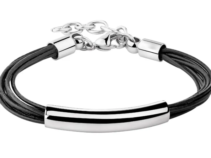 Bransoletę wykonano ze stali szlachetnej i elementów wykonanych z rzemienia.