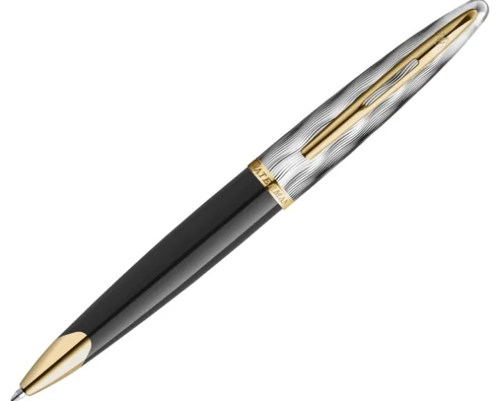 Waterman Carène, długopis, metal i czarny lakier ze złotymi zdobieniami, cyzelowana nasadka, końcówka medium.