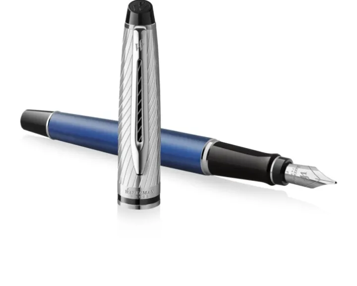 Pióro wieczne Expert Deluxe Blue zapewnia łatwość pisania i pozwala wyrazić górnolotne ambicje oraz wyjątkowy gust. Zwężający się kształt korpusu i wygrawerowany na nasadce profilowany wzór pasków, których inspiracją jest ponadczasowa elegancka moda męska, dodają użytkownikowi francuskiego szyku, pewności siebie i autorytetu podczas każdej okazji wymagającej pisania. Wyjątkowy lakierowany korpus w metalicznym odcieniu niebieskiego, charakterystyczny rozdwojony klips Waterman i nasadka z fasetami tworzą spójną całość z eleganckim logo w kształcie litery „W” na stalówce ze stali szlachetnej. Kolekcja Expert Deluxe – Symbol ambicji