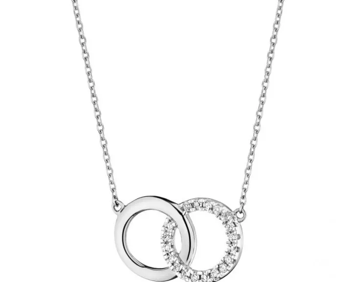 Złoty naszyjnik z rozświetloną diamentami zawieszką w formie dwóch przenikających się kółeczek z białego złota. Naszyjnik wyróżnia się bezpretensjonalnym stylem i uniwersalnym designem, który świetnie sprawdzi się zarówno do codziennych, jak i bardziej eleganckich stylizacji.