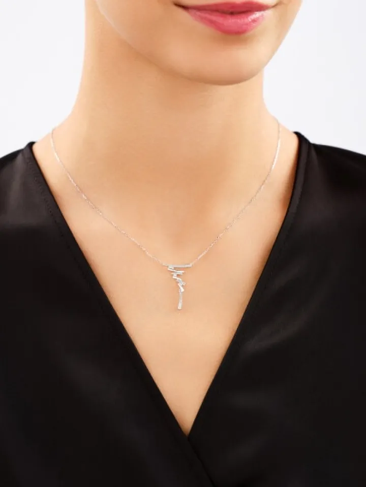 Złoty naszyjnik z diamentami to propozycja dla kobiet, które poszukują nietuzinkowej odsłony najbardziej szlachetnych kamieni. Zawieszka naszyjnika przypomina kształtem literę ze sztuki japońskiej kaligrafii, dzięki czemu biżuteryjny wzór nabrał intrygującego charakteru. Naszyjnik wykonano z żółtego złota próby 585, a tajemniczą zawieszkę rozświetla 39 diamentów o łącznej masie 0,09 ct. Kunszt, z jakim oprawiono najszlachetniejsze kamienie sprawia, że złoty detal nabrał wielowymiarowego charakteru. Naszyjnik z diamentami w takim wydaniu jest zarówno elegancki, jak i oryginalny. To prawdziwa ozdoba dekoltu, stworzona dla kobiet ceniących design najwyższej próby, a więc wzór powinien dołączyć do ich osobistych kolekcji biżuterii. Do naszyjnika zaprojektowano także pasujące i równie niebanalne diamentowe kolczyki ze złota.