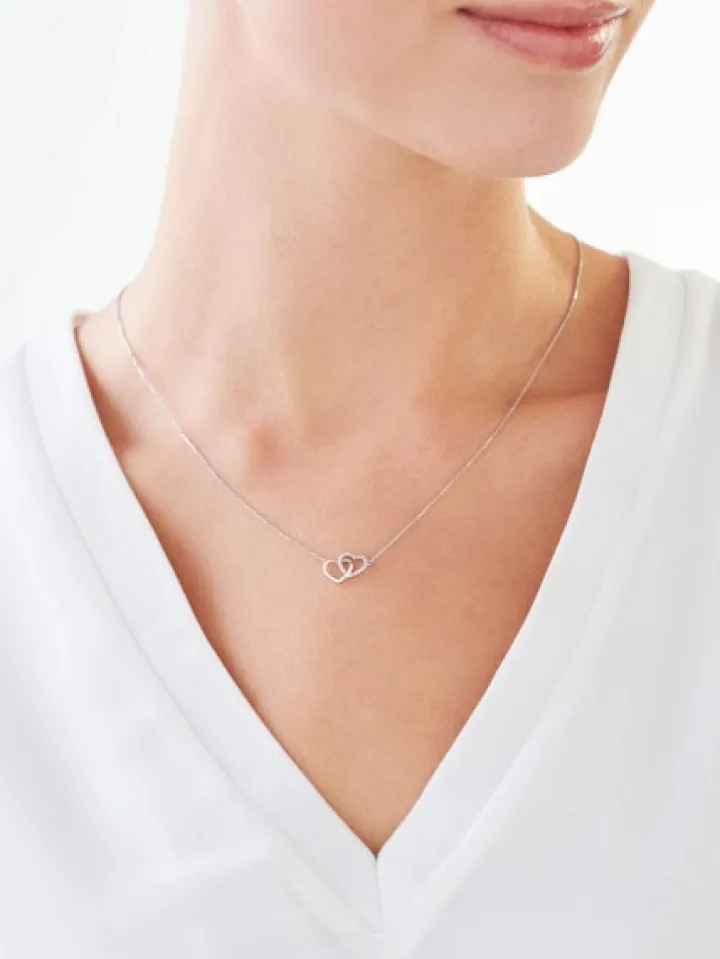 Romantyczny naszyjnik z białego złota, ozdobiony filigranowym duetem serc oraz subtelnym połyskiwaniem diamentu. Naszyjnik ma regulację długości, dzięki czemu można go dopasować do swoich preferencji, a splecione symbole serca dodają mu wdzięku i delikatności. Wzór, podobnie jak pasująca bransoletka z kolekcji, doskonale spełnią rolę upominku.