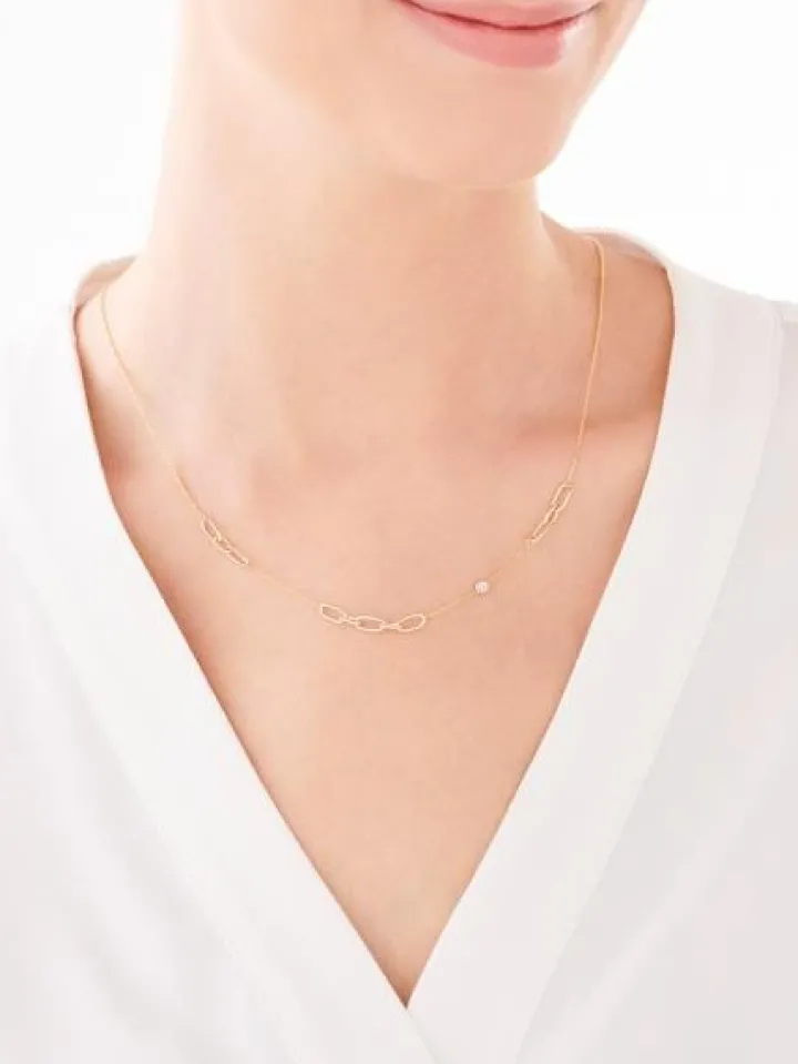 Modny, intrygujący i przykuwający uwagę – taki właśnie jest złoty naszyjnik z diamentami. Naszyjnik o średniej długości, którą dodatkowo można regulować i dopasować do swoich preferencji, wykonano z żółtego złota próby 375. Wzór ma formę delikatnego łańcuszka, z którym połączono dekoracyjne elementy w formie wyrazistych ogniw łańcucha. Tak niebanalny design przypieczętowano blaskiem 2 diamentów o łącznej masie 0,006 ct. Kamienie oprawiono w ozdobnym kółeczku, jeden na awersie, a drugi na rewersie detalu, dzięki czemu nawet w przypadku odwrócenia się naszyjnika podczas noszenia, zawsze będzie połyskiwał diamentowymi refleksami. Diamentowy naszyjnik z pasującą do kompletu bransoletką z kolekcji Simple Shine to idealny pomysł na prezent dla kobiety, która ceni diamenty ujęte w biżuteryjne projekty zainspirowane aktualnymi trendami.