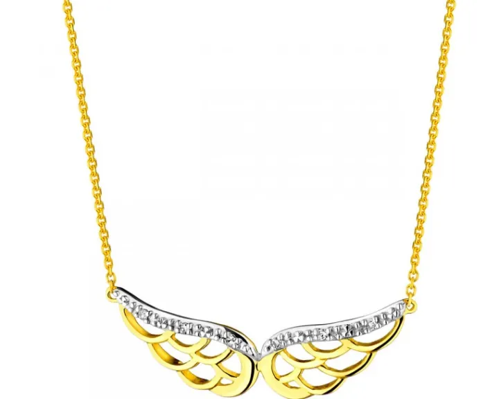Ozdobiony zawieszką w kształcie skrzydeł subtelny naszyjnik z żółtego złota i diamentów. Filigranowe złote skrzydła o ażurowej formie połyskują i lśnią intensywnym blaskiem sześciu diamentów. Takie same diamentowe detale zdobią pasujące do kompletu kolczyki i bransoletki. Naszyjnik oraz współgrające z nim biżuteryjne detale to gotowy upominek dla kobiety w każdym wieku, niezależnie od okazji.
