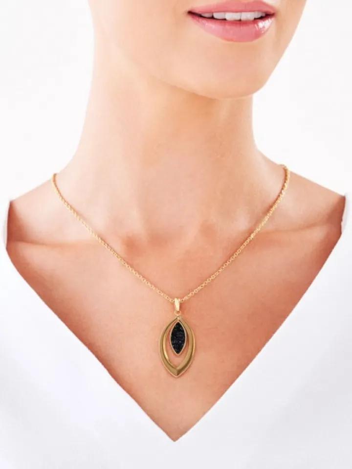 Elegancki naszyjnik ze stali szlachetnej w kolorze złota. Minimalistycznej formie zawieszki naszyjnika dodano wyrazistości dzięki kontrastowym refleksom gęstej kompozycji czarnych kryształów. Wzór szczególnie stylowo prezentuje się w komplecie z połyskującymi kryształami kolczykami z kolekcji marki Elixa.