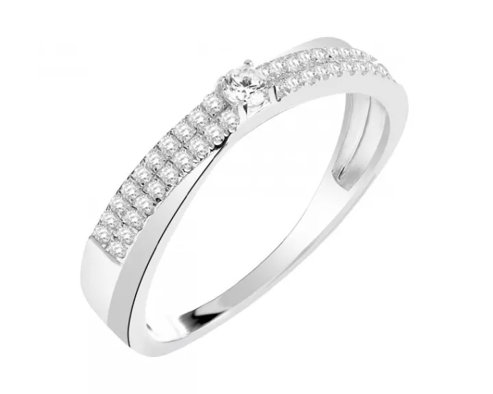 Zniewalający blaskiem białych cyrkonii pierścionek ze srebra. Jego prosty kształt jest doskonałym tłem dla kunsztownie oprawionej kompozycji skrzących się kamieni, intensywnie połyskujących i migoczących kaskadą nieskazitelnych refleksów.