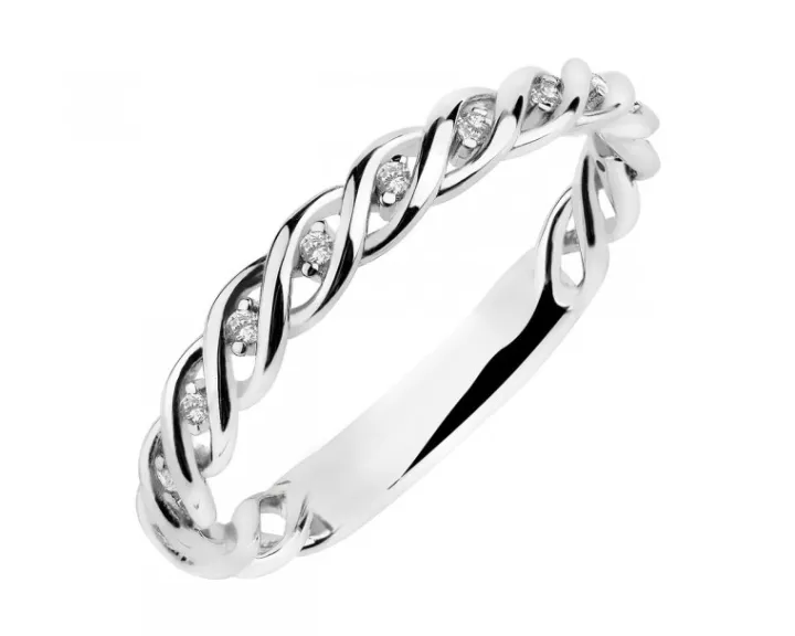 Srebrny pierścionek w kształcie obrączki o strukturze delikatnego splotu. Ażurową, dekoracyjną formę pierścionka ozdobiono regularną kompozycją połyskujących białych cyrkonii. Wzór można nosić jako samodzielny dodatek lub zakładać jednocześnie z innymi wzorami.
