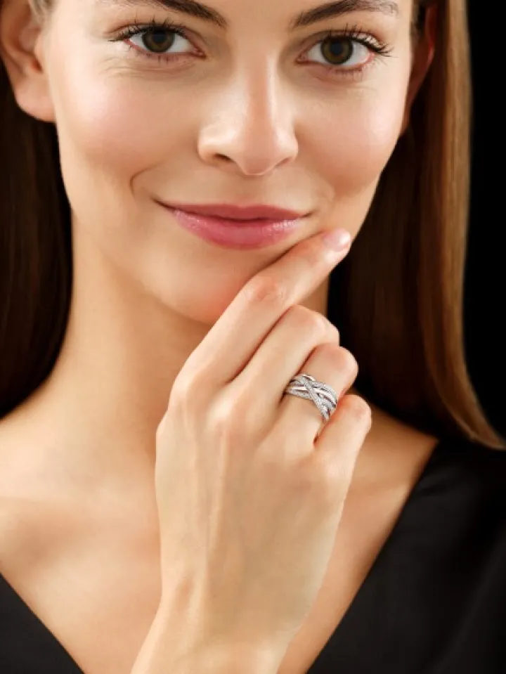 Efektowny pierścionek z brylantami. Złoty pierścionek zachwyca motywem przenikających się elementów o łagodnych liniach z białego złota, tworzących ażurową kompozycję rozświetloną brylantami. Pierścionek z brylantami w takim wydaniu prezentuje się po założeniu elegancko, nowocześnie i szykownie. Idealny pierścionek z brylantami dla wielbicielek nowoczesnego stylu w biżuterii.