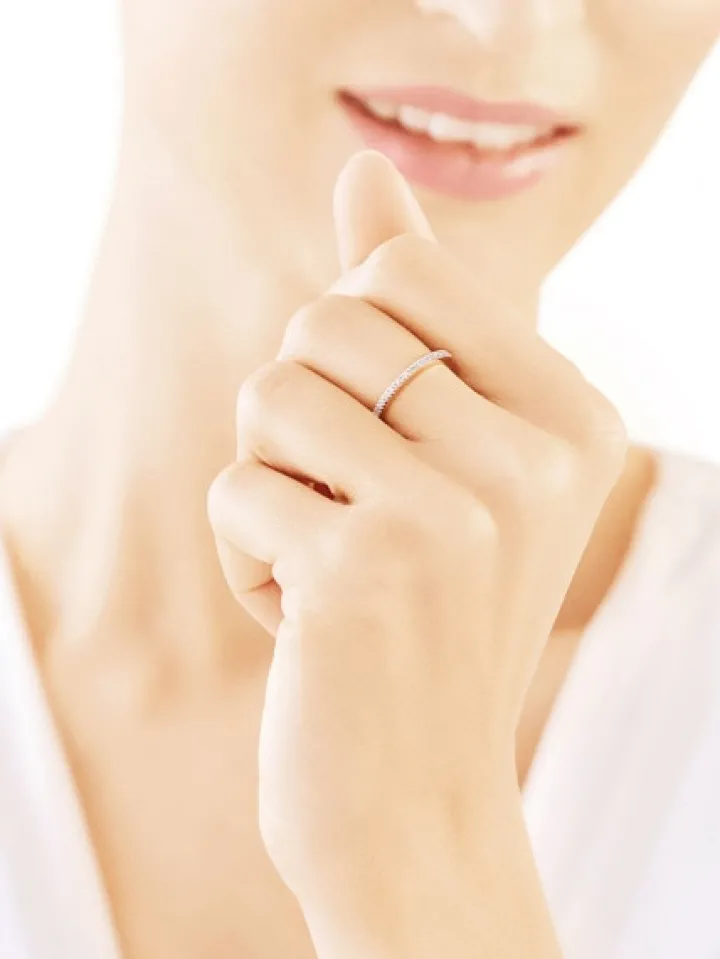 Obrączkowy pierścionek z białego złota z diamentami. Delikatny złoty pierścionek w minimalistycznym stylu to idealny wybór dla wielbicielki dyskretnej elegancji podkreślonej diamentami. Pierścionek z diamentami można nosić jako samodzielny dodatek lub jednocześnie z innym pierścionkiem na palcu.