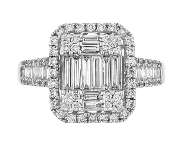 - Diament – Kształt/Szlif: Bagieta, 28 szt. o łącznej masie 0,72 ct, Czystość / Barwa: VS2-SI1/G,