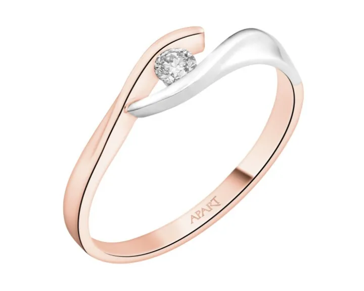 Chwila zaręczyn przypieczętowana diamentowym blaskiem. Brylant w linearnych, delikatnie otwartych objęciach subtelnej szyny pierścionka zaręczynowego z różowego złota, płynnie przechodzącego w białe. Zaproponowana, wymykająca się klasyce forma, pozwala w pełni podziwiać kamień i misterną kompozycję jego szlifów.