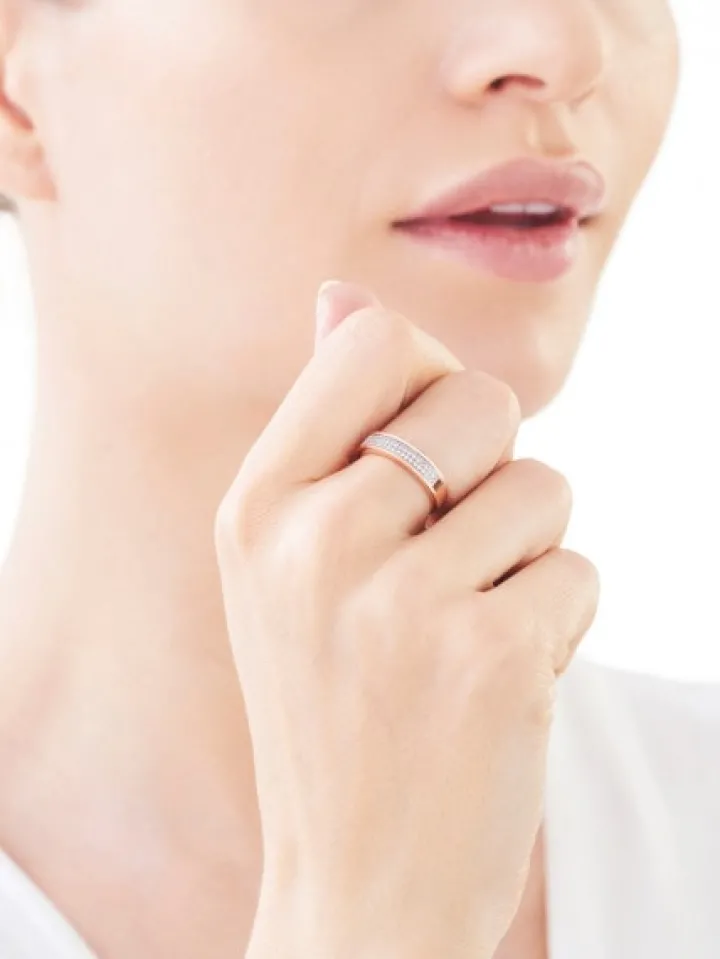 Luksus skąpany w słońcu Monaco i diamentowym blasku. Ozdobiony diamentami pierścionek z różowego złota w charakterystycznym stylu kolekcji. Graficzna, szlachetna prostota kształtu obrączki została podkreślona kunsztownie oprawioną, regularną kompozycją maleńkich diamentów.
