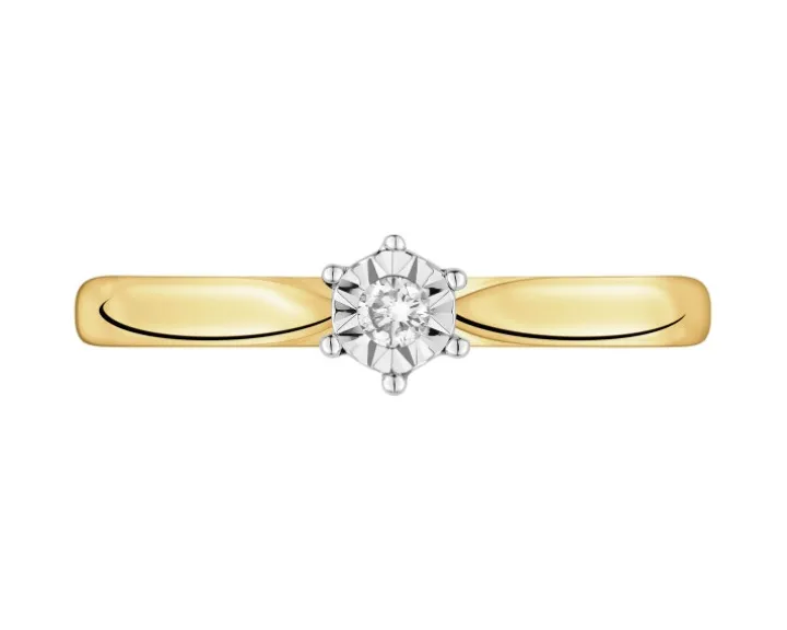 Klasyczny pierścionek zaręczynowy z brylantem. Ponadczasowy blask brylantu ujęty w subtelną formę pierścionka to idealny wzór zaręczynowy. Pierścionek zaręczynowy wykonano z żółtego złota, a elementy oprawy brylantu, w tym fasetowaną otoczkę, która optycznie powiększa kamień z białego złota. Subtelny i pełen blasku wzór idealnie podkreśli romantyczny charakter chwili zaręczyn.