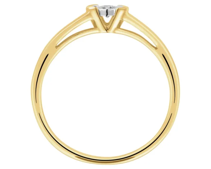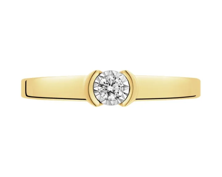 Chwila zaręczyn przypieczętowana diamentowym blaskiem. Pierścionek zaręczynowy z żółtego złota o nowoczesnej, minimalistycznej formie, rozświetlonej lśnieniem diamentu o brylantowych szlifach. Zniewalający blask brylantu zyskał intensywność, a sam kamień optycznie powiększono, otaczając go fasetowanym, kolistym detalem z białego złota.