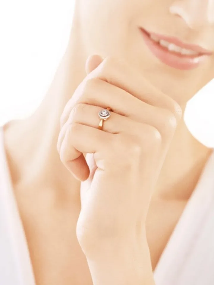Chwila zaręczyn przypieczętowana diamentowym blaskiem. Lśnienie diamentu o brylantowym szlifie otulone pełną oprawą to szlachetna ozdoba pierścionka o stonowanej formie. Miękkie, koliste linie białego złota otaczają rozmigotany kamień, harmonijnie łącząc się z refleksami żółtego złota.