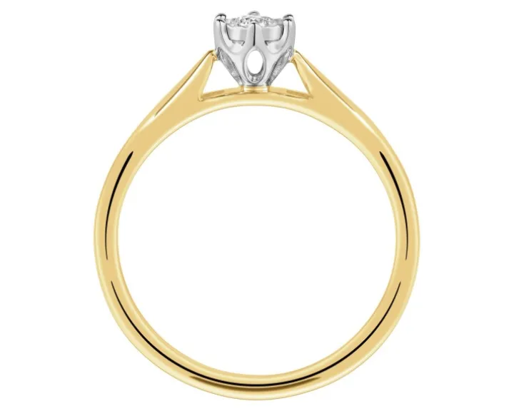 Chwila zaręczyn przypieczętowana diamentowym blaskiem. Szykowna prostota pierścionka z żółtego złota eksponuje brylant, oprawiony w sześć krap, którego blask zyskał intensywność dzięki fasetowanej otoczce z białego złota, optycznie powiększającej kamień.