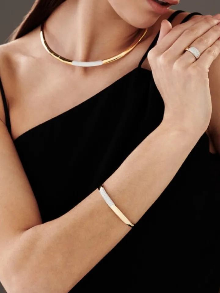Efektowny złoty pierścionek z brylantami. Nowoczesny wzór z żółtego złota ma formę rozszerzającej się obrączki, ozdobionej zachwycającą kunsztem oprawy, regularną kompozycją brylantów. Dzięki temu, złoty pierścionek z brylantami przykuwa uwagę niemal jednolitą taflą blasku. Pierścionek z brylantami spodoba się kobietom poszukującym w biżuterii stylowej elegancji.