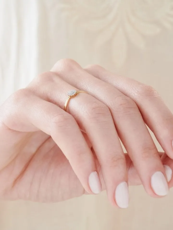 Chwila zaręczyn przypieczętowana zwielokrotnionym diamentowym blaskiem. Nastrojowe piękno, wyrażone za pomocą kolistej kompozycji maleńkich diamentów. Delikatny pierścionek subtelnie połyskuje blaskiem 19 najszlachetniejszych kamieni, które tworzą jednolitą, migotliwą całość.