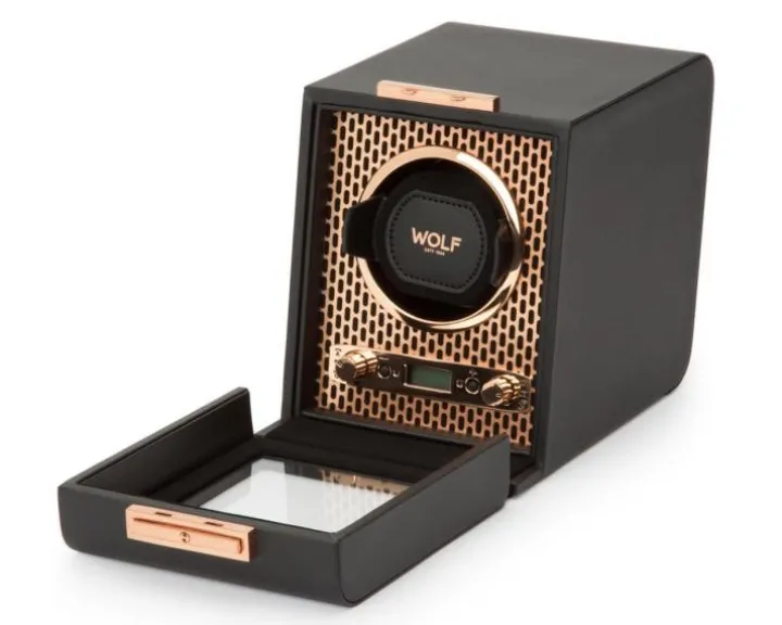 Rotomat o wymiarach 14 x 20,8 x 17,4 cm. Przeznaczony dla jednego zegarka. Wykonany ze skóry wegańskiej.