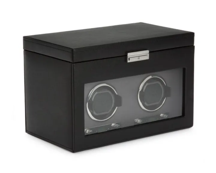 Rotomat o wymiarach 34 x 21 x 23 cm. Przeznaczony dla dwóch zegarków. Posiada dodatkowe miejsca na przechowywanie oraz etui podróżne. Wykonany ze skóry wegańskiej.