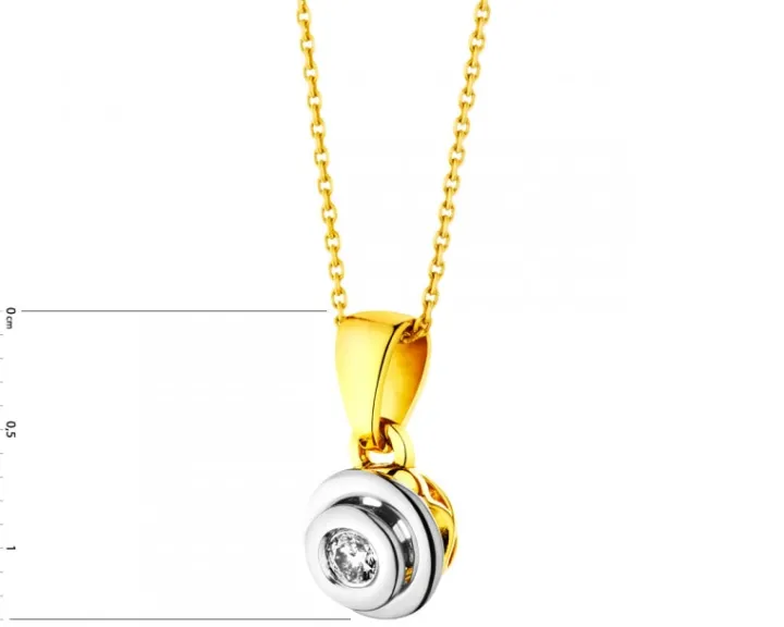 Zawieszka z diamentem o pogłębionym blasku brylantowego szlifu dzięki pełnej oprawie. Miękkie, koliste linie białego złota otulają szlachetny kamień, harmonijnie łącząc się z ciepłymi refleksami żółtego złota.