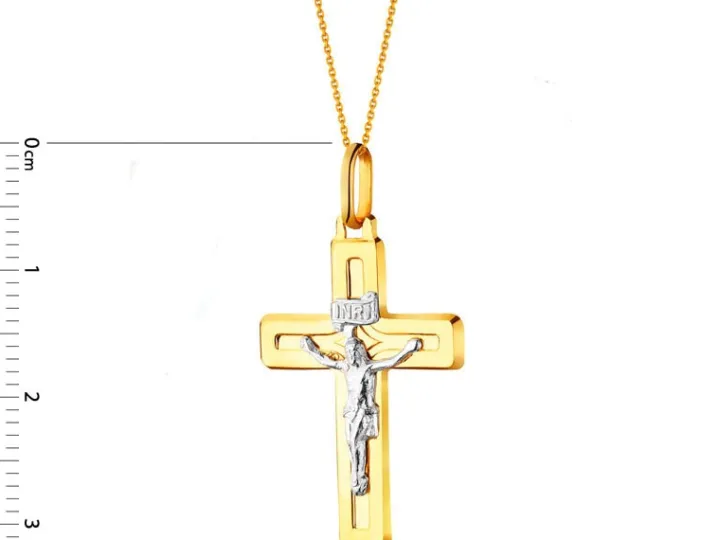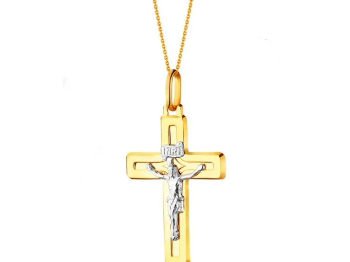 Okazała złota zawieszka w kształcie klasycznego łacińskiego krzyża pasyjnego, w którym przejmujący obraz ukrzyżowania został wyeksponowany przez połączenie dwóch kolorów kruszcu: krzyż wykonano z żółtego złota, natomiast napis INRI i postać Chrystusa – niezwykle wyrazistą w tym zestawieniu – ze złota rodowanego. Zawieszka o dużym ładunku emocjonalnym i znaczeniu symbolicznym dla osób wierzących.