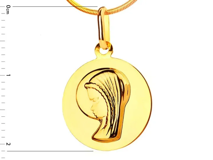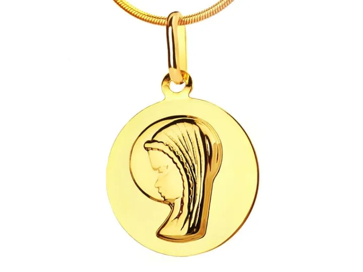 Medalik z wizerunkiem twarzy młodej Maryi, przedstawionej z profilu, wokół której lśni boski nimb. Zawieszce dodaje blasku szlachetny kruszec, z którego jest wykonana, jak również lśniąca otoczka, dzięki której delikatny relief z postacią świętej wydaje się większy i bardziej wyrazisty. Doskonały prezent z okazji chrzcin, Pierwszej Komunii Świętej czy urodzin.