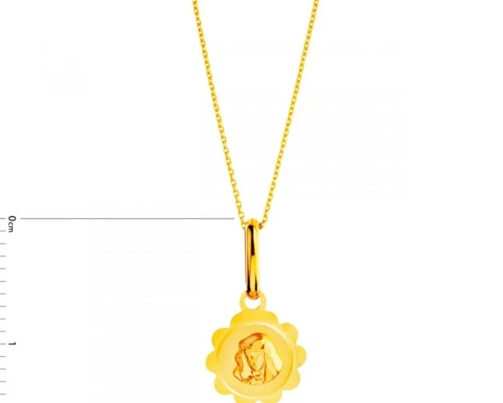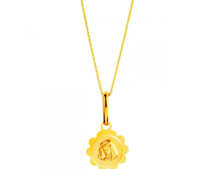 Zawieszka z 14-karatowego złota o niezwykle oryginalnym kształcie, miękkimi falistymi liniami otaczająca twarz młodej Maryi. Otulona złotą chustą Matka Jezusa spogląda w dół w zamyśleniu. Forma delikatnego reliefu nadaje wizerunkowi trójwymiarowość, przybliżając przedstawioną na nim postać. Doskonały prezent z okazji chrzcin, Pierwszej Komunii Świętej czy urodzin.