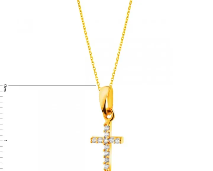 Biżuteryjny klejnot w kształcie krzyża, bogato zdobiony jedenastoma cyrkoniami, osadzonymi w 14-karatowym żółtym złocie. Prostota formy przełamana iskrzącym blaskiem cyrkonii.