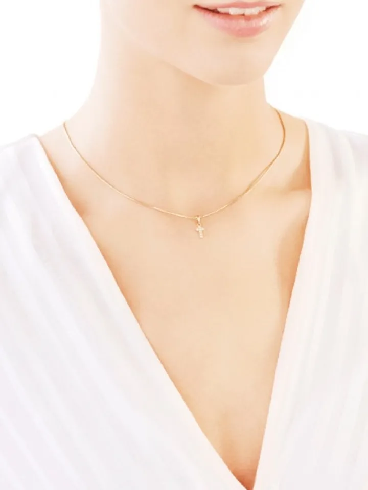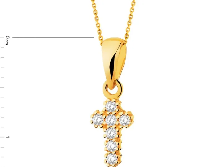 Biżuteryjna złota zawieszka w kształcie krzyża, mieniąca się blaskiem siedmiu cyrkonii, z których każda otoczona jest ośmioma krapami z 8-karatowego złota. Miniaturowy klejnot dla bliskiej osoby.