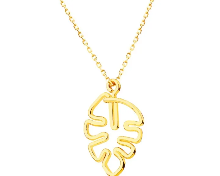 Złoty naszyjnik z dekoracyjną zawieszką w kształcie ażurowego liścia. Odwołujący się do piękna natury wzór wspaniale będzie współgrał z różnymi stylizacjami, zwłaszcza w połączeniu z pasującymi do kompletu kolczykami i bransoletką.