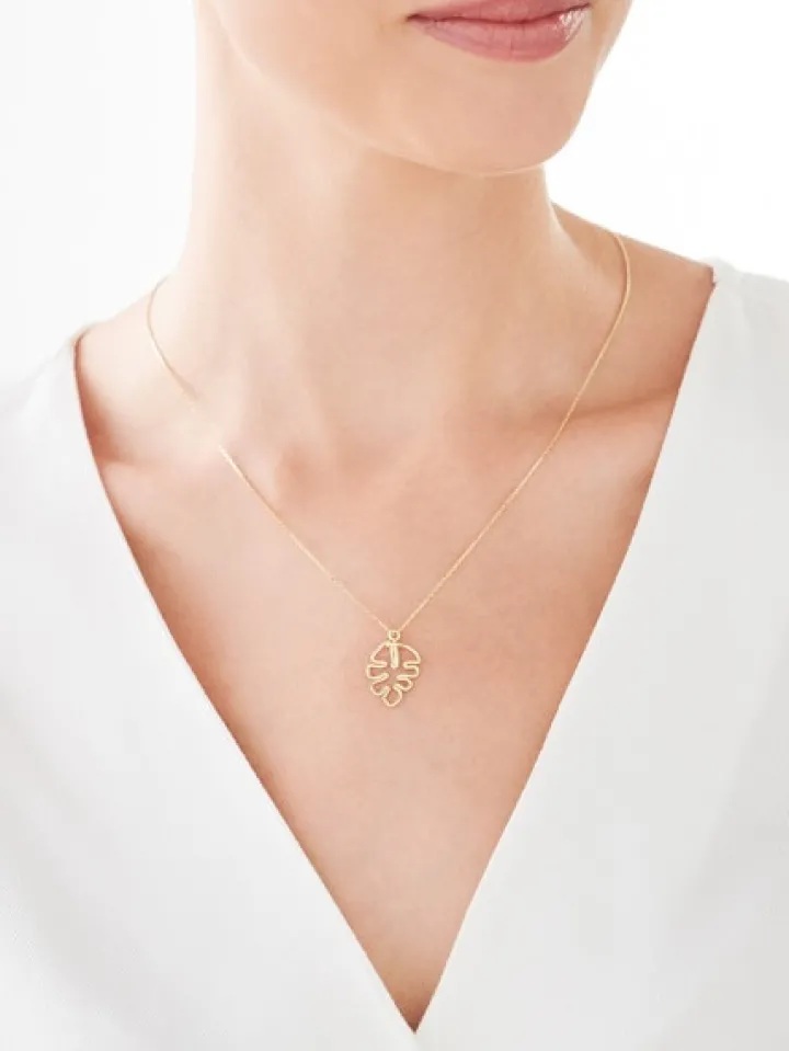 Złoty naszyjnik z dekoracyjną zawieszką w kształcie ażurowego liścia. Odwołujący się do piękna natury wzór wspaniale będzie współgrał z różnymi stylizacjami, zwłaszcza w połączeniu z pasującymi do kompletu kolczykami i bransoletką.