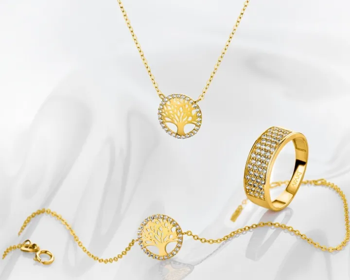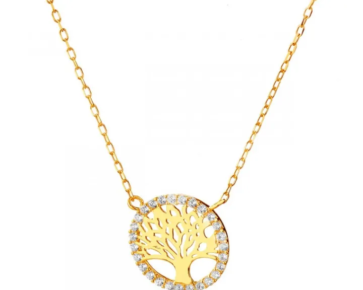 Złoty naszyjnik z blaskiem cyrkonii dedykowany miłośniczkom piękna natury. Naszyjnik z żółtego złota, podobnie jak pasującą do niego bransoletkę, ozdobiono motywem w kształcie drzewa, zamkniętego w delikatną kolistą formę. Subtelny dekoracyjny detal podkreślono dodatkowo kompozycją kunsztownie oprawionych cyrkonii.