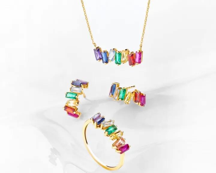 Złoty naszyjnik z cyrkoniami przykuwa uwagę bogatą paletą barw. Kolorowe cyrkonie o szlifie bagieta oprawiono w delikatną formę podkreślając ich wyjątkowy blask. Zjawiskowy naszyjnik z kolekcji Magic Crystals pokochają miłośniczki elegancji i prestiżu, świadome swojego naturalnego piękna. Świetnie sprawdzi się on jako dopełnienie stylizacji do pracy czy niezobowiązujący detal casualowego look’u. Naszyjnik z kolekcji Magic Crystals najpiękniej zaprezentuje się wraz z kolczykami, bransoletką i pierścionkiem do kompletu, tworząc czarujący zestaw złotej biżuterii z cyrkoniami na imprezę.