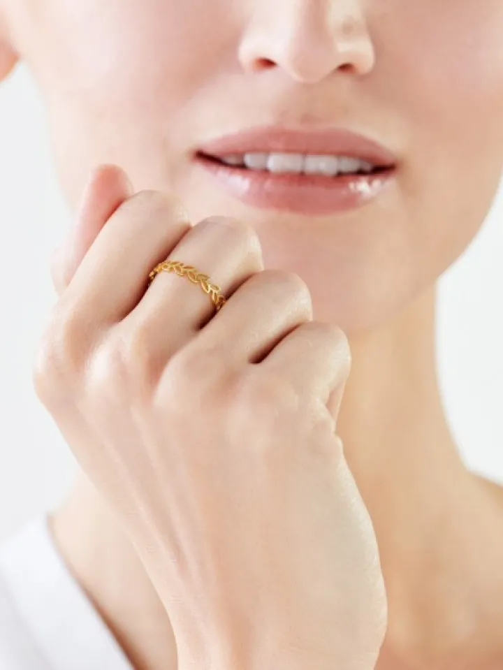 Nawiązujący do kształtu wieńca laurowego złoty pierścionek. Delikatne ażurowe elementy przypominające kształt liścia oplatają kobiecy palec subtelną kompozycją z żółtego złota. Eteryczny wzór spodoba się wielbicielkom modnych nawiązań do świata natury w biżuterii.