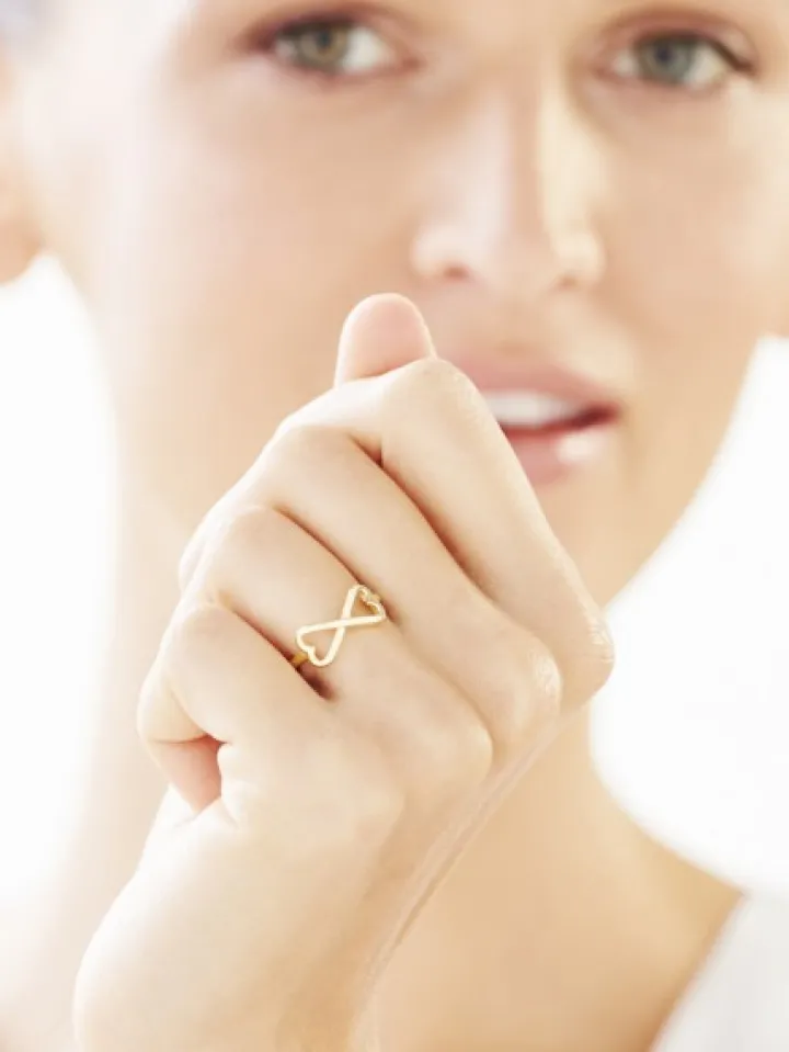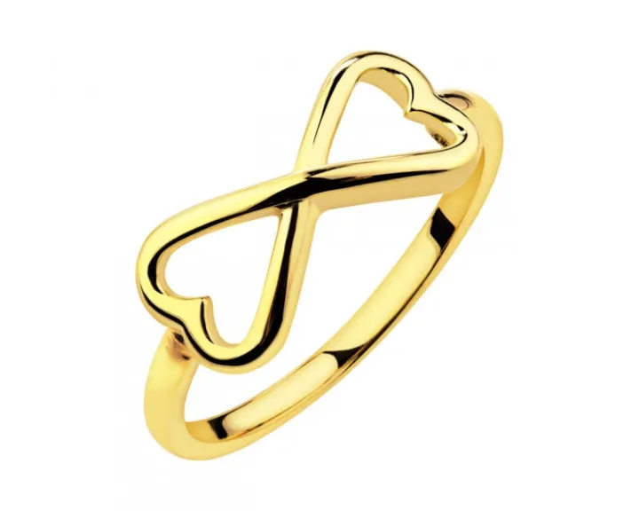 Złoty pierścionek z wymownym elementem dekoracyjnym, łączącym symbol nieskończoności z kształtem serc. Wykonany z żółtego złota wzór doskonale sprawdzi się jako wyjątkowy upominek dla bliskiej kobiety. Subtelny, pełen romantycznych skojarzeń pierścionek zadedykowano wielbicielkom symbolicznych motywów w biżuterii.