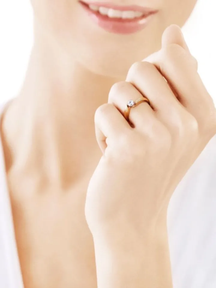 Złoty pierścionek o klasycznej, nieprzemijającej urodzie, którą delikatnie przełamuje asymetryczna szyna. Sercem klejnotu jest skrząca się blaskiem cyrkonia, zamknięta w czterech krapach z białego złota.