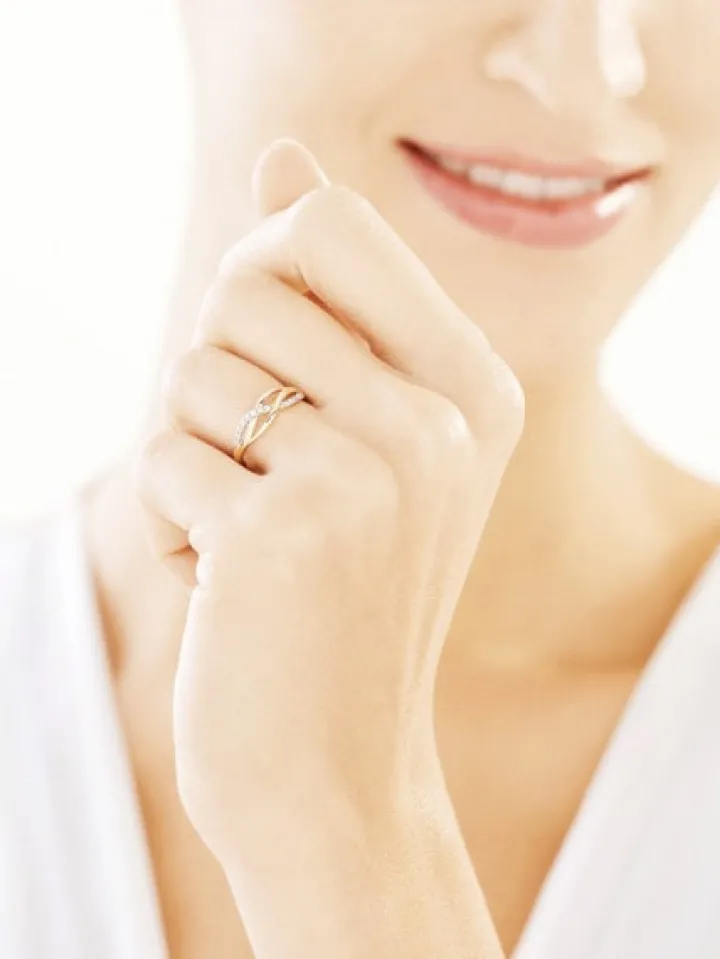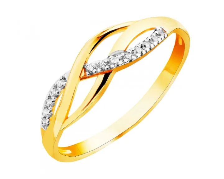 Ozdobiony cyrkoniami i motywem splotu pierścionek z żółtego złota. Założony, wzór prezentuje się delikatnie, przykuwając uwagę subtelnym ażurowym deseniem, podkreślonym blaskiem kunsztownie oprawionej kompozycji białych cyrkonii. Pierścionek można dodatkowo ozdobić grawerunkiem.