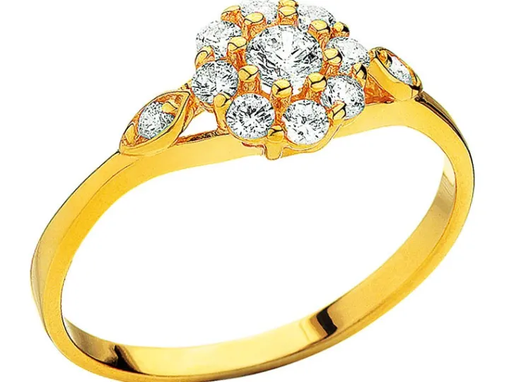 Okazały pierścionek, bogato zdobiony jedenastoma cyrkoniami, skrzy się refleksami ich migotliwego światła i blaskiem 8-karatowego żółtego złota. Jego wyrazisty charakter i dopracowana w najdrobniejszych szczegółach forma wywierają niezapomniane wrażenie.