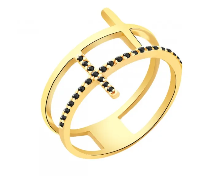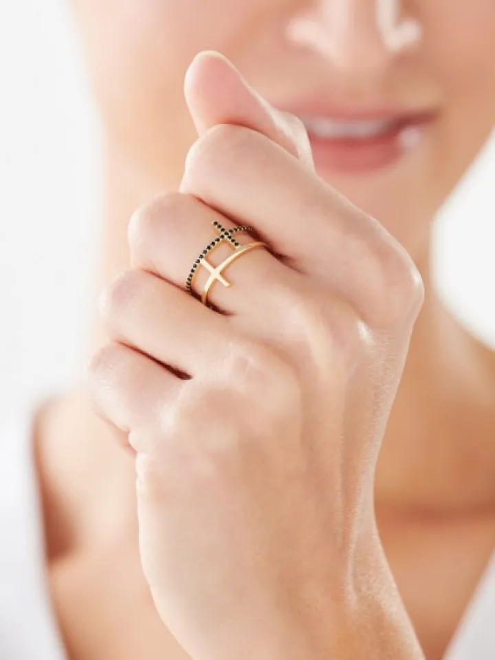 Ozdobiony czarnymi cyrkoniami pierścionek z żółtego złota. Pierścionek zaskakuje oryginalną, transparentną formą połączonych motywów delikatnych krzyżyków i intensywnym kontrastem kompozycji czarnych, kunsztownie oprawionych cyrkonii. Wzór spodoba się kobietom poszukującym nowoczesnych dodatków biżuteryjnych w nietuzinkowym stylu.