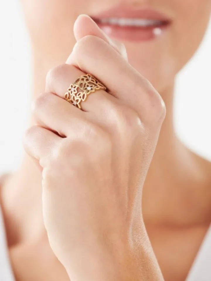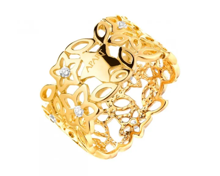 Fantazyjny złoty pierścionek z delikatnym efektem lśnienia białych cyrkonii. Ażurowy wzór z misternie połączonych detali zachwyca kunsztowną kompozycją kwiatowych motywów i delikatnego migotania cyrkonii. Pierścionek łączy się w zniuansowany komplet z kolczykami, zawieszką oraz bransoletką.