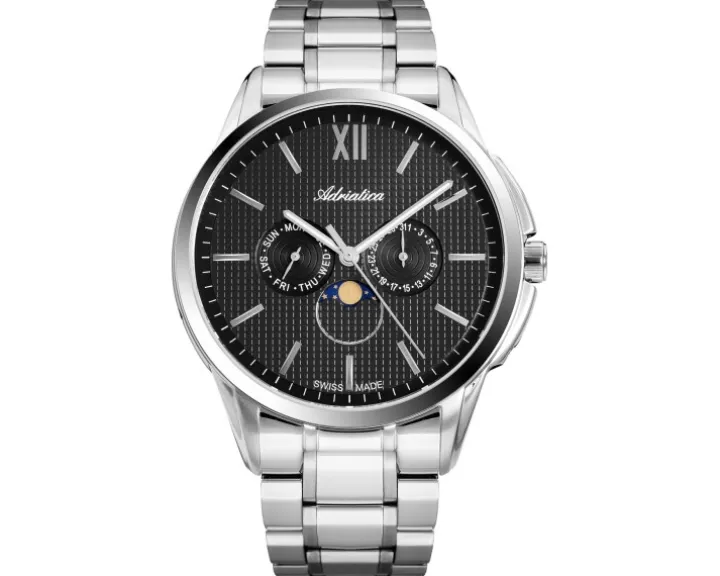 Cechy: datownik, wskazówkowy, sekundnik, wskaźnik dnia tygodnia, wskaźnik faz Księżyca