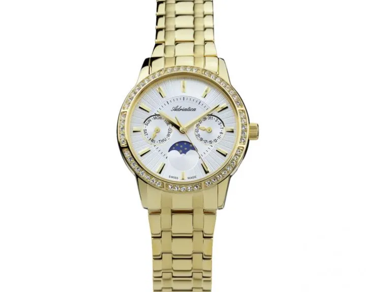 Cechy: zegarek szwajcarski, datownik, wskazówkowy, sekundnik, wskaźnik dnia tygodnia, wskaźnik faz Księżyca