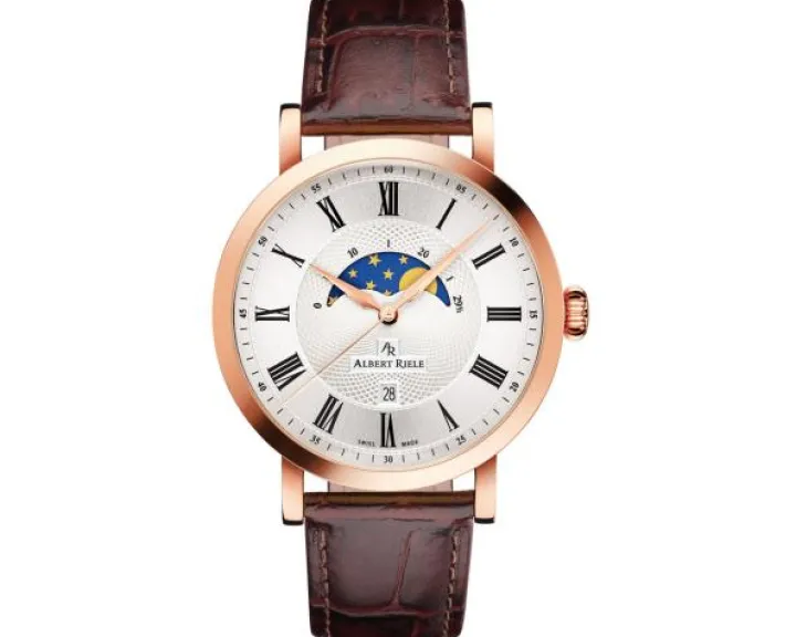 Cechy: zegarek szwajcarski, datownik, wskazówkowy, sekundnik, wskaźnik faz Księżyca