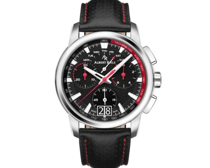 Cechy: zegarek szwajcarski, chronograf, datownik, wskazówkowy, mały sekundnik, tachymetr, wskaźnik dnia tygodnia