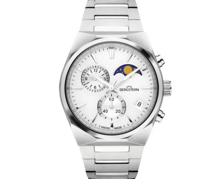 Cechy: zegarek szwajcarski, chronograf, datownik, wskazówkowy, mały sekundnik, wskaźnik faz Księżyca, wskaźnik zużycia baterii