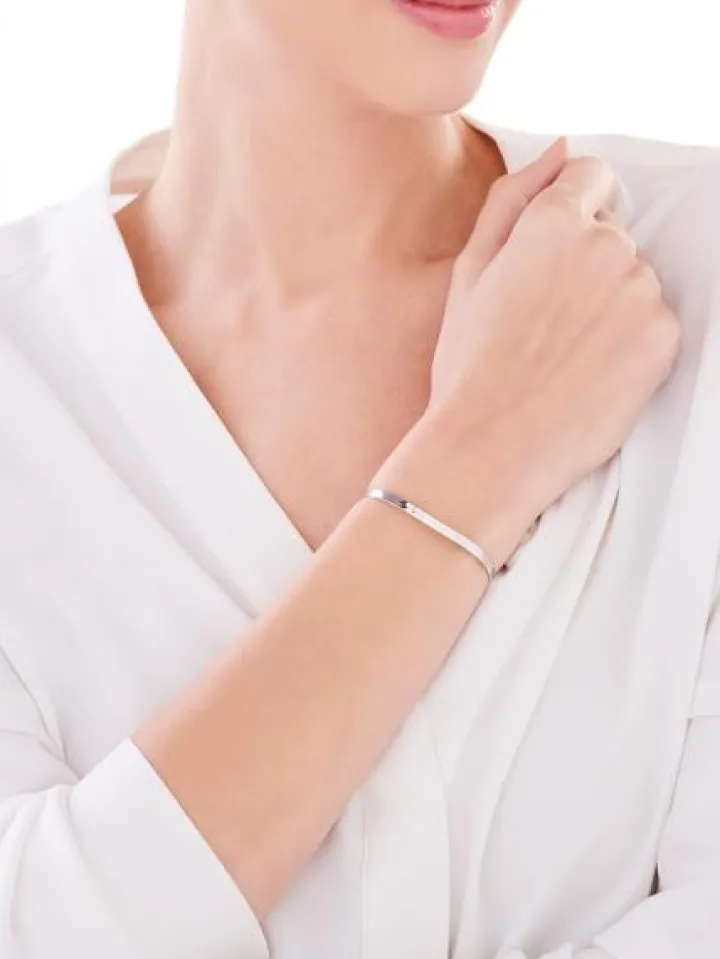 Minimalistyczna bransoletka ze srebra próby 925. Wzór o strukturze splotu taśma przykuwa uwagę niemal idealnie gładką powierzchnią. To biżuteria zaprojektowana w zgodzie z najnowszymi trendami, dyskretna w formie, a jednocześnie zwracająca uwagę błyszczącymi refleksami. Bransoletka taśma doskonale prezentuje się w komplecie z dopasowanym srebrnym naszyjnikiem. Modny efekt uzyskamy także łącząc te wzory z biżuterią w kontrastującym stylu. Taka kompozycja, stworzona według własnego pomysłu, będzie wyrazistym, modowym zwieńczeniem stylizacji.