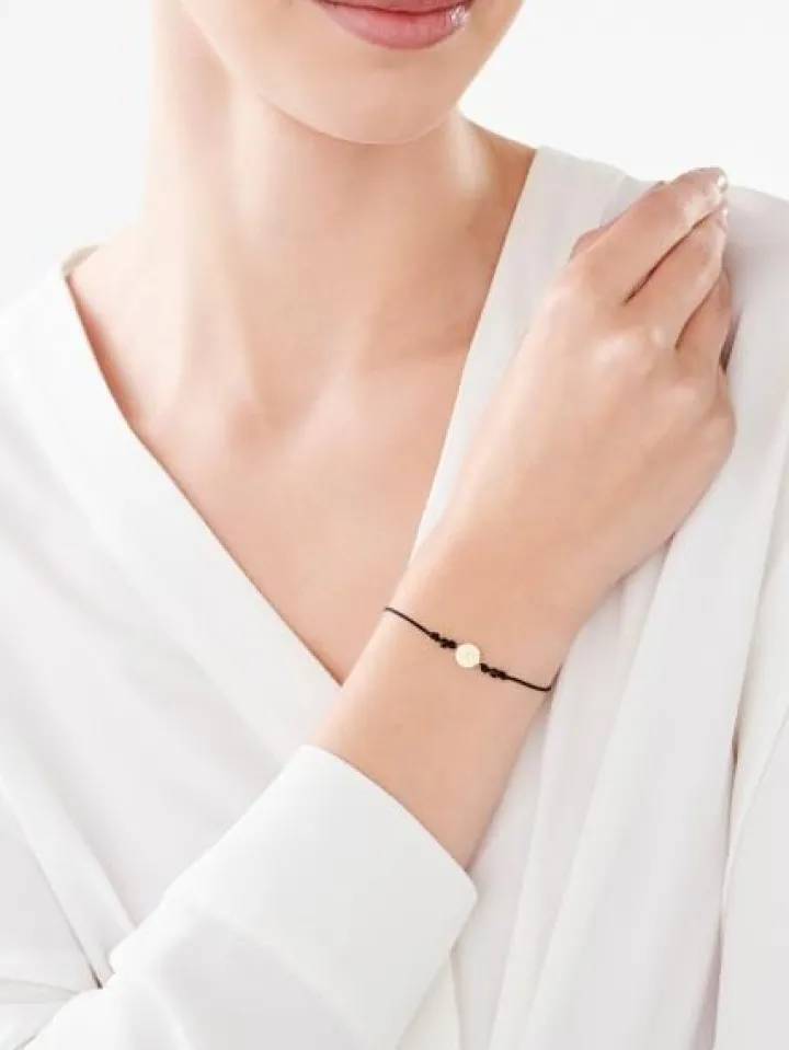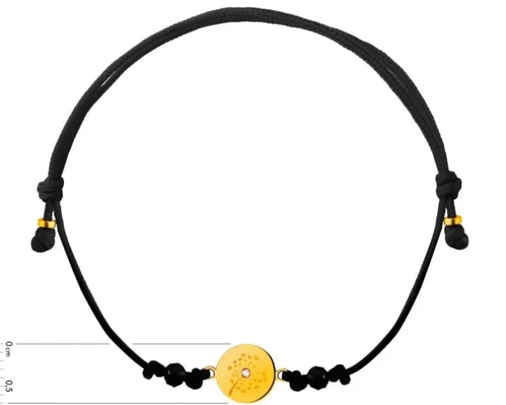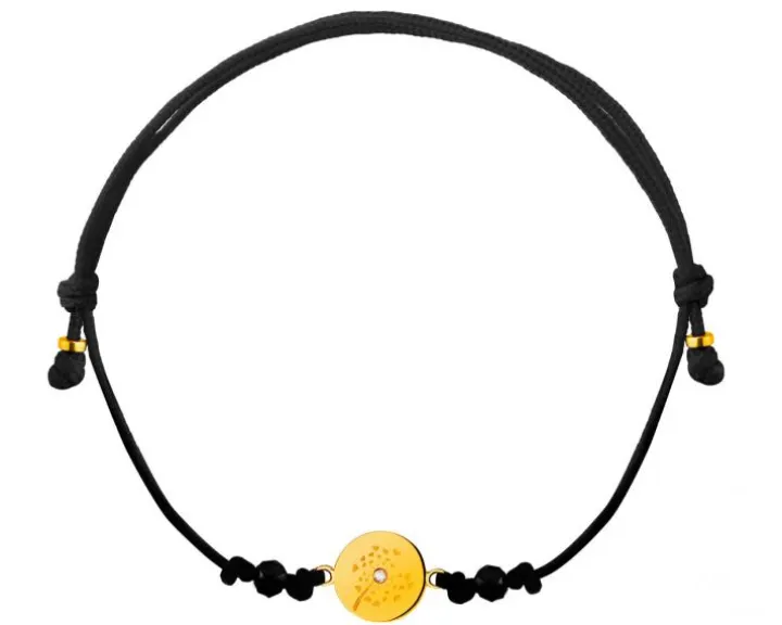 Delikatna bransoletka ze złotym kółkiem, cyrkonią i regulowanym sznurkiem. Wzór ze złotą, okrągłą zawieszką ozdobiono dekoracyjnym grawerunkiem i rozświetlono białą cyrkonią. Zainspirowany stylem boho dodatek jest subtelny oraz romantyczny i doskonale współgra z wieloma stylizacjami.